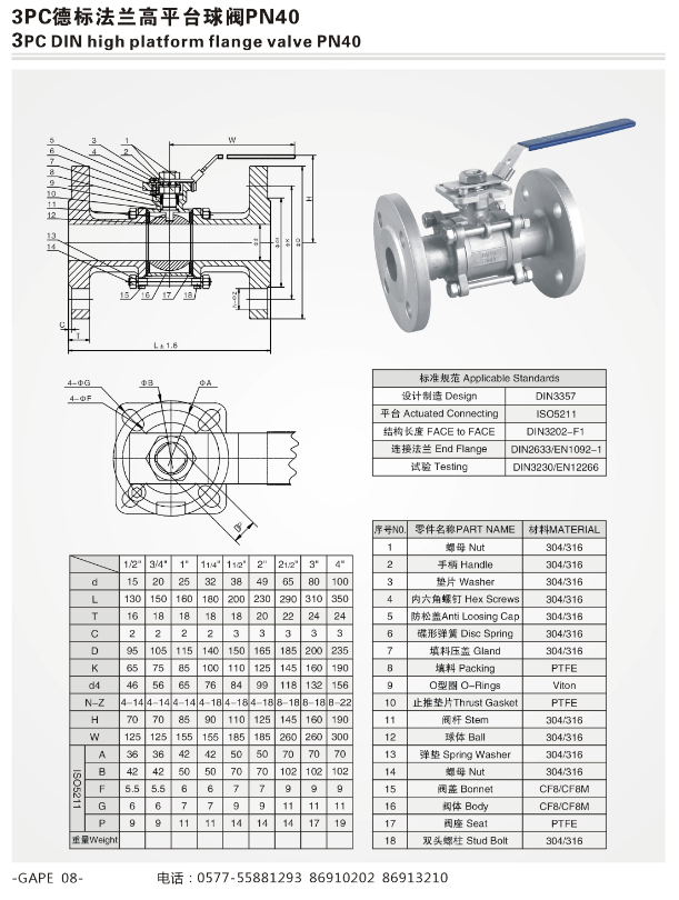 三片式高平臺德標法蘭球閥PN40
